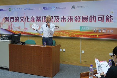 梁慶庭首先介紹了澳門文化產業現狀。特區政府在二零一三年底成立文產基金,主要是為配合澳門經濟適當多元,支持本地文化產業發展。文產基金的資助項目以企業投資為主,基金扶持為輔,首批獲批資助的項目中,獲批款項平均佔整體投資額的百分之十五。