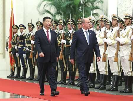會談前,習近平在人民大會堂北大廳為阿爾貝二世舉行歡迎儀式。楊潔篪、王毅等參加。