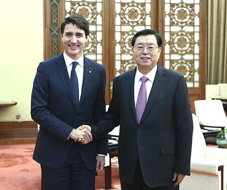 【中新社北京12月5日電】(記者 張蔚然)全國人大常委會委員長張德江5日在人民大會堂會見了加拿大總理特魯多。