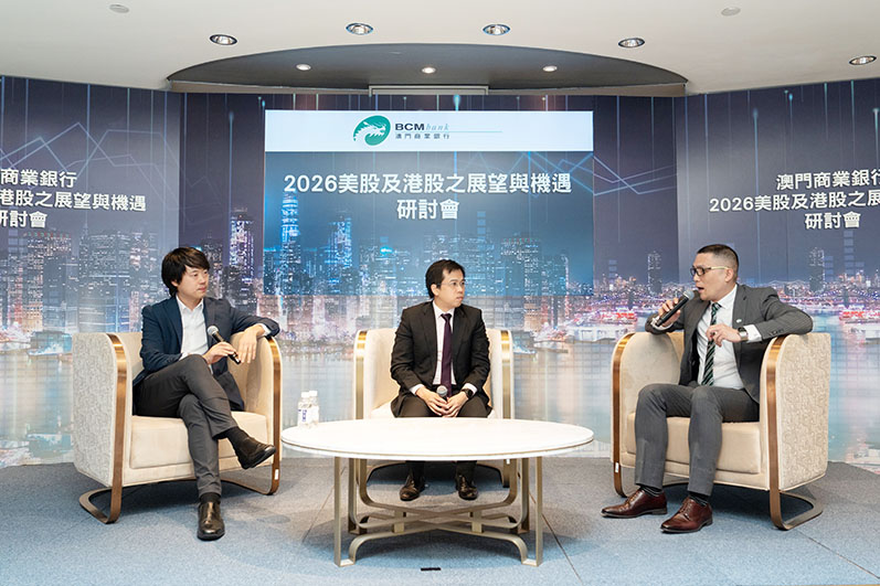 【特訊】為助力客戶掌握全球投資先機,澳門商業銀行於日前(11 月 22 日)假澳門新濠鋒酒店宴會廳成功舉辦「2026 美股及港股之展望及機遇」研討會,並邀請香港財經界著名股評人何啟聰先生及戴捷先生擔任主講嘉賓,向現場超過 120 名來賓剖析 2026 年美股及港股市場走勢與探討策略方向。該行亦藉此研討會詳細介紹其全新的「美國證券買賣服務」,協助客戶開展多元投資之旅。