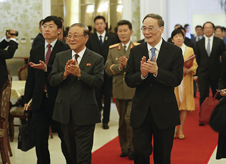 王岐山向朝鮮同志70年來在社會主義革命和建設事業中取得的豐碩成果表示祝賀。他說,中朝是山水相連的友好近鄰。今年以來,習近平總書記和金正恩委員長舉行了3次歷史性會晤,為中朝關係長遠發展提供了指南。不論國際和地區形勢如何變化,中國黨和政府致力于鞏固發展中朝關係的堅定立場不會變,中國人民對朝鮮人民的友好情誼不會變,中國對社會主義朝鮮的支持不會變。中方願同朝方一道,切實落實好兩國最高領導人達成的重要共識,推動兩國關係不斷取得新的更大發展。