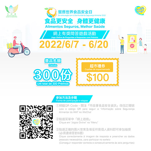 6月7日起至6月20日將舉辦食安網上有獎問答遊戲,內容圍繞外賣食品安全及《外賣食品活動場所的登記制度》。市民只要於微信平台上搜索「市政署食品安全資訊」,透過掃瞄二維碼,關注「市政署食品安全資訊」微信訂閱號後,點選菜單中「網上遊戲」,便可參加遊戲。只要連續答對六題問題,並填妥所需個人資料,即可參加抽獎。獎品為面值100澳門元的超市現金券,名額共300份,歡迎市民踴躍參與,得獎名單將於7月公佈。另外,市政署亦會於本澳社區派發以世界食安日為主題的宣傳單張、活動海報及擺放食安資訊展示品,務求將食安知識帶入社區,共同維護本澳食品安全。