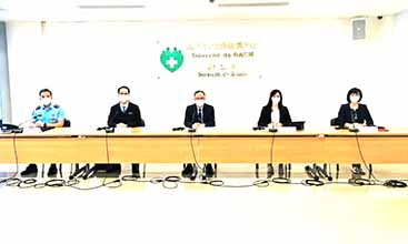 新型冠狀病毒感染應變協調中心昨日舉行記者會,衛生局仁伯爵綜合醫院醫務主任李偉成、旅遊局傳播及對外關係廳廳長劉鳳池、衛生局疾病預防及控制中心傳染病防控處處長梁亦好、警察總局警務聯絡及公共關係處處長張健欣、治安警行動及通訊處處長馬超雄分別介紹本澳及鄰近地區整體防疫情況。