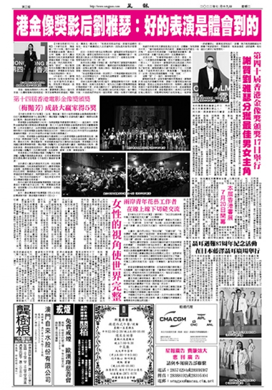 第四十屆香港金像獎頒獎17日舉行 謝賢劉雅瑟分獲最佳男女主角