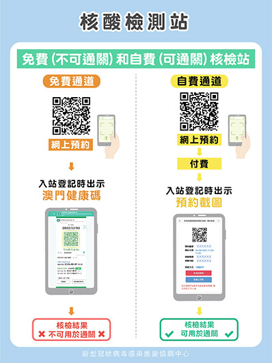 使用核酸檢測站免費通道,需使用免費核檢站預約連結進行預約,入站登記時出示澳門健康碼,採樣和核檢結果可在澳門健康碼頁面顯示,但不可用作通關。