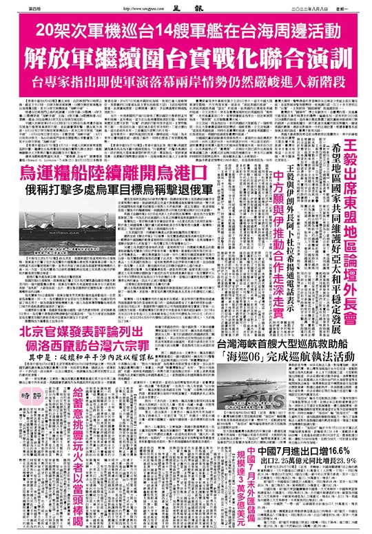 中國人民解放軍8月4日12時至7日12時在台島周邊多個海空域進行重要軍事演訓行動,並組織實彈射擊。據台軍方消息,8月3日有27架次解放軍軍機巡台,其中22架次穿越“海峽中線”;8月4日有22架次巡台,全數穿越“海峽中線”;8月5日則有49架次,為台防務部門發佈空情動態以來數量第二多,其中30架次穿越“海峽中線”。