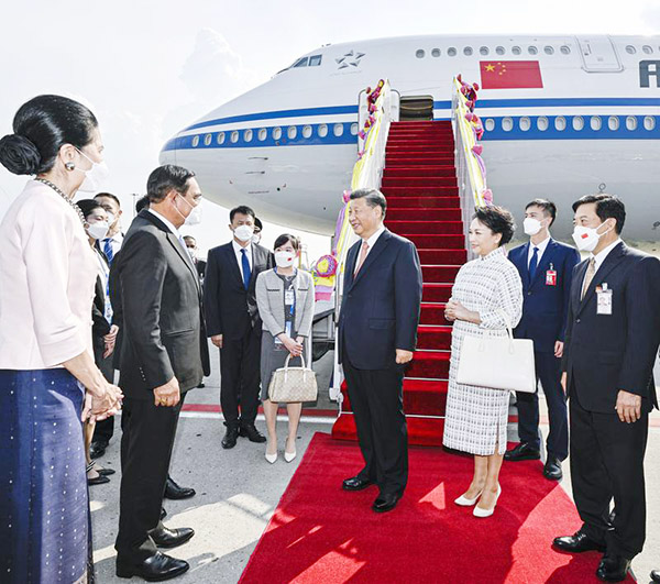 習近平和夫人彭麗媛乘坐的專機抵達曼谷素萬那普國際機場時,泰國總理巴育夫婦、副總理兼外長敦夫婦、文化部部長伊提蓬夫婦等熱情迎接。禮兵分列紅地毯兩側,身著靚麗民族服裝的當地青年行合十禮夾道歡迎,泰國華僑華人代表揮舞中泰兩國國旗,向習近平夫婦表示最熱烈的歡迎。