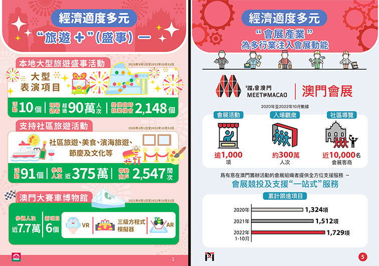 2020年至2022年10月,在澳舉辦的會展活動超過1,000項,入場觀眾約300萬人次,貿促局累計組織近1萬名會展客商深入澳門多個社區遊覽消費。結合本地各類節日盛事,為參展參會客商制訂特色路線,體驗澳門城市魅力,支持本地中小企,發揮「乘數效應」,拉動餐飲、運輸、搭建、廣告、酒店等行業,惠及不同行業的發展。