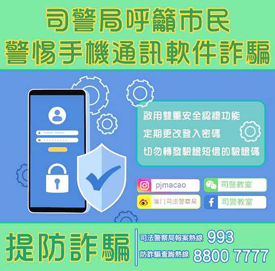 因此,司警局呼籲市民須提高防罪警覺,如手機接到不明來電或即時通訊軟件的語音來電,尤其是以「猜猜我是誰」的方式嘗試展開對話,應循多方途徑核實求證對方身份,切勿貿然轉帳匯款,慎防遭受財產或其他損失。另外,為時刻保障即時通訊軟件的帳號安全,應啟用雙重安全認證功能、定期更改登入密碼,以及切勿將任何驗證短信的驗證碼轉發他人,避免通訊軟件帳號被盜用。