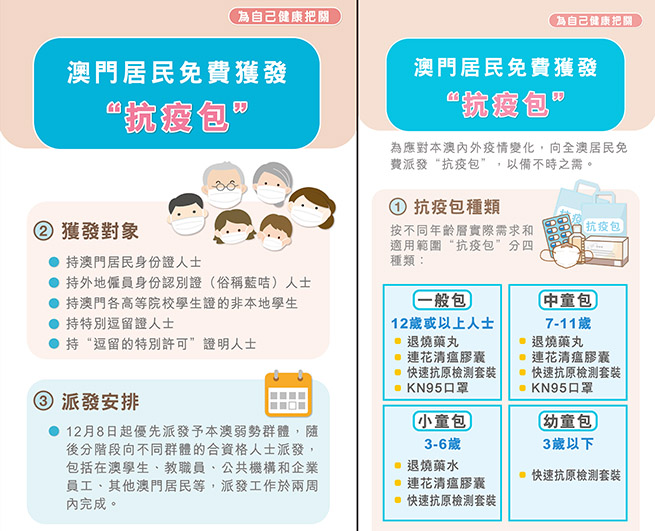 1、」抗疫包」種類:一般包:適用於12歲或以上人士,內含退燒藥丸、連花清瘟膠囊、快速抗原檢測套裝及KN95口罩;中童包:適用於7至11歲兒童,內含退燒藥丸、連花清瘟膠囊、快速抗原檢測套裝及KN95口罩;小童包:適用於3至6歲兒童,內含退燒藥水、連花清瘟膠囊及快速抗原檢測套裝;幼童包:適用於3歲以下嬰幼兒,內含快速抗原檢測套裝。