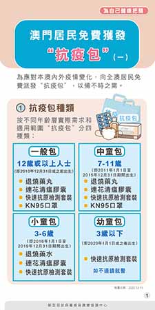 【特訊】為應對本澳內外疫情變化,新型冠狀病毒感染應變協調中心(下稱應變協調中心)向全澳居民免費派發“抗疫包”,以備不時之需,並按不同年齡層的實際需求和適用範圍分4個種類,首階段已於12月8日起優先派發給本澳弱勢群體,並由社會工作局協調有關機構派發,相關人士毋須自行前往領取;教育及青年發展局已協調了各非高等教育機構向合資格的教職員及學生派發,相關人士亦毋須自行前往領取;而12月14日至18日開展的第二階段“抗疫包”派發工作,對象則為其他合資格人士,具體安排如下: