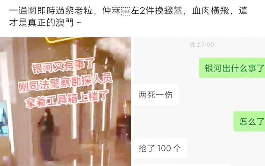 就上述事件,司警昨日亦發出警情通告,指由本月八日至今,該局沒有接獲相關舉報或通知;經向相關酒店保安部求證,也查明不存在上述事件,可以確定上述帖文內容純屬虛假。司警隨即立案偵查,並已將相關涉案人士緝捕歸案。根據本澳《刑法典》第三百三十條(虛構犯罪)的規定,在無將犯罪歸責於特定之人下,向有權限當局檢舉犯罪,或使有權限當局懷疑有人實施犯罪,而明知該犯罪並無發生者,處最高一年徒刑,或科最高一百二十日罰金。