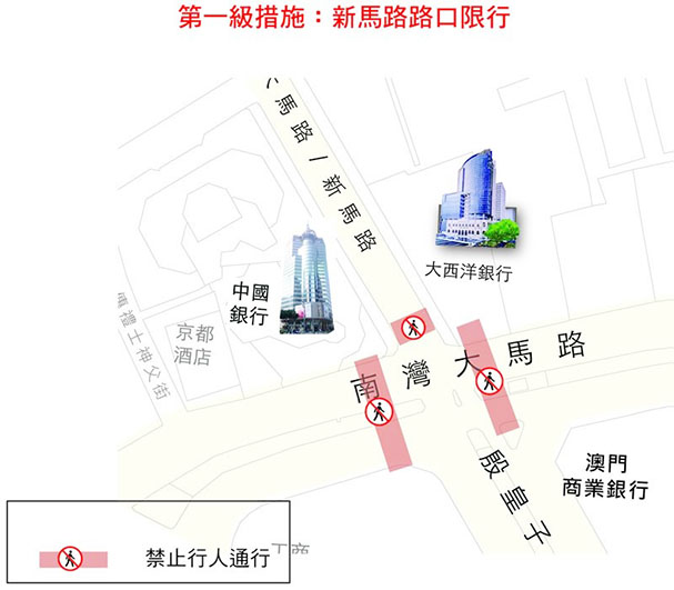 當新馬路一帶人群十分密集時,會立刻安排警員疏導人流車流,並禁止使用新馬路與南灣大馬路交界以下三條人行橫道橫過馬路,包括:大西洋銀行與中國銀行之間的人行橫道、大西洋銀行與商業銀行之間的人行橫道及中國銀行與英皇南灣中心之間的人行橫道。