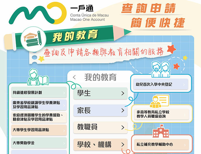 【特訊】「一戶通」即日起推出「我的教育」,學生、家長、教職員、學校及機構可於「一戶通」辦理與教育相關的申請手續,包括多項學習用品津貼及獎助學金的申請、申請各項聲明書、查閱持續進修發展計劃個人進修帳戶紀錄;為子女辦理「幼兒首次入學中央登記」手續等。