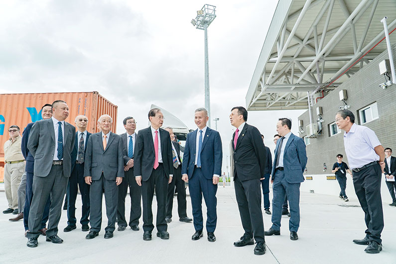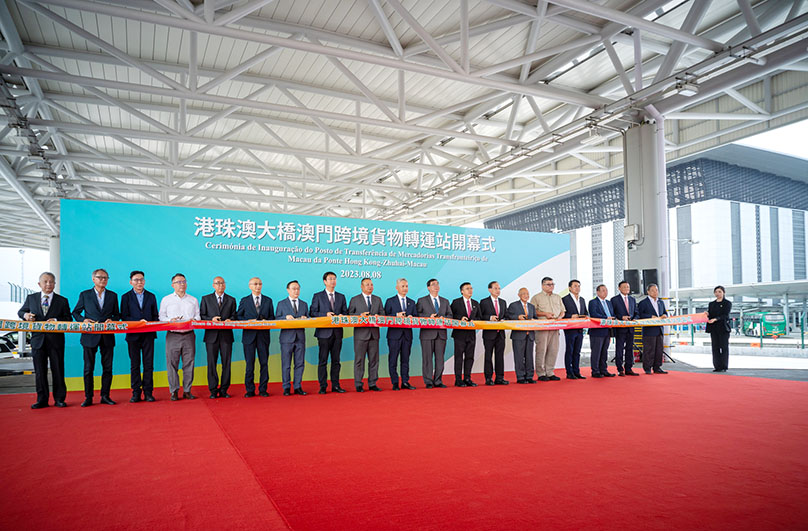 港珠澳大橋澳門跨境貨物轉運站開幕儀式於昨日舉行,經濟及科技發展局局長戴建業、澳門海關助理關長李煜輝、交通事務局副局長鄭岳威,以及行業商會領導共同主持開幕式。