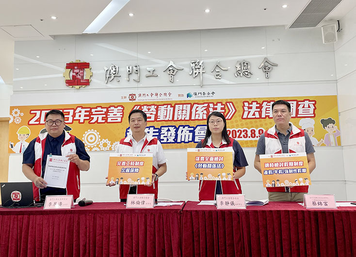 調查顯示,近四成受訪者曾遇到過與勞動權益有關問題,近六成受訪者認為現行《勞動關係法》對工人權益保護不足,當局自上次提出《勞動關係法》修法框架至法例正式實施前後已逾五年,期間本澳經濟社會發展出現了較大變化,包括博彩產業進行了重大調整、新興產業逐步興旺、「1+4」適度多元發展策略實施、區域尤其琴澳融合發展加快以及勞動領域各種問題突顯,社會對完善和檢討相關勞動法律的呼聲再起。工聯建議當局重視僱員勞動權益保障,以推動勞動保障法制建設為標的,審時度勢,及早啟動全面檢討《勞動關係法》工作,並公佈具體時間表。