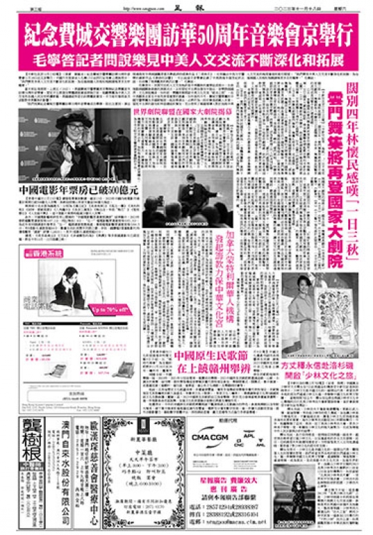 【中新社北京11月13日電】(張素 謝雁冰)紀念費城交響樂團訪華50周年音樂會11月10日在北京舉行。中國外交部發言人毛寧13日在例行記者會上應詢表示,“我們樂見中美人文交流不斷深化和拓展,為促進兩國人民相知相親譜寫更多友好篇章。”