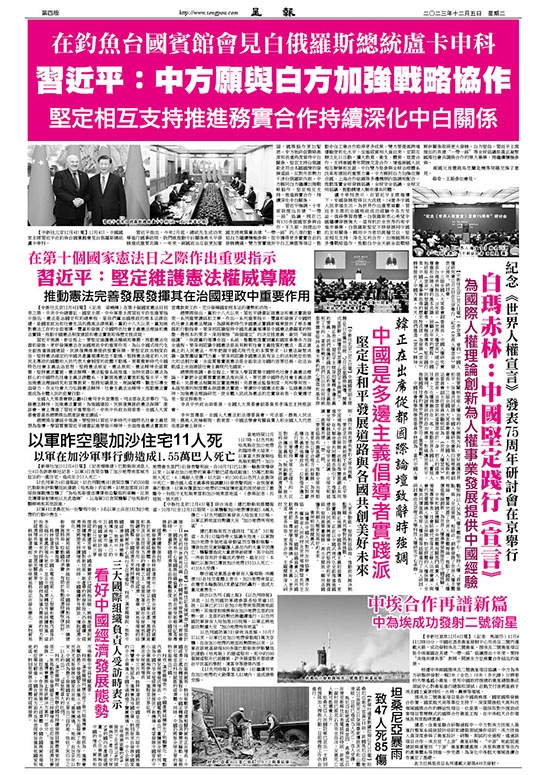 習近平強調,十年前我提出共建“一帶一路”倡議,現在已有150多個國家參與合作。不久前,我提出中國支持高質量共建“一帶一路”的八項行動,歡迎白方繼續積極參與,從中獲得更多實實在在的發展機遇。雙方要實施好中白工業園等項目,推動中白工業合作取得更多成果。雙方要提高跨境運輸便利化水平,促進經貿和人員往來。定期互辦文化日活動,擴大教育、衛生、體育、旅遊合作,支持兩國青年開展交流合作,增進兩國人民相互瞭解和友誼。中白雙方是參與全球治理體系改革和建設的重要力量。中方願同白方加強在聯合國、上海合作組織等多邊機制內協調和配合,推動落實全球發展倡議、全球安全倡議、全球文明倡議,推動構建人類命運共同體。