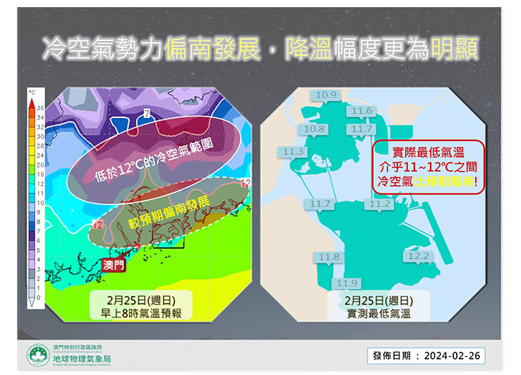 氣象局表示,受東北季風影響,本澳剛過去的週六(二十四日)晚間氣溫開始明顯下降,氣象局亦於週日凌晨零時發出黃色低溫提示,按早前的預測資料顯示,預料這次的冷空氣過程影響範圍僅達到珠江口以北地區,但由於其冷空氣勢力以較快速度偏南發展,導致本澳的降溫幅度更為明顯,週日(二十五日)錄得最低氣溫介乎攝氏十一至十二度之間。