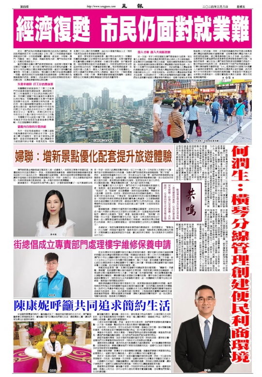 另一方面,有不少研究都提及澳門要發展多元經濟,有社會人士曾提出,要高本澳經濟的韌性就必須走上多元發展道路,而本澳的多元發展離不開文化旅遊、商貿及會展等產業的共同發展,而這些產業的發展也需要與大灣區聯動才能相得益彰。在二零二三年澳門市民就業流動性調查中,受訪者對融入大灣區就業的意願是較去年上升,但不熟悉大灣區發展政策的受訪對象比例同樣亦較去年上升。有意見則認為,政府對於大灣區發展政策應多加宣傳,尤其是對於中、大學生的宣傳應更詳盡和前瞻,讓他們在生涯規劃中能把大灣區發展考慮進去,這樣才能增加未來兩地就業人口的流動。同時,亦有意見建議政府研究建立與粵港澳大灣區和國際接軌的資歷架構,並與粵港澳大灣區內地九市和香港特區接軌,建立粵港澳勞動力和人才市場一站式網站。並應要善用社會協調常設委員會和經濟發展委員會的功能,加強政府與勞、資以及加入澳門高校等教育培訓機構代表協作,整合特區政府包括勞工局、教青局等不同部門政策措施資源,引導本澳勞資雙方遵循特區「1+4」經濟適度多元發展方向規劃人力資源的部署等等。雖然現時本澳經濟正逐步復蘇,但仍然有不少巿民要面對不同程度的就業困難,希望當局不要滿足於全球第五的虛榮當中,而應切實推動本澳多元發展,解決巿民就業困難問題。 * 小生 *