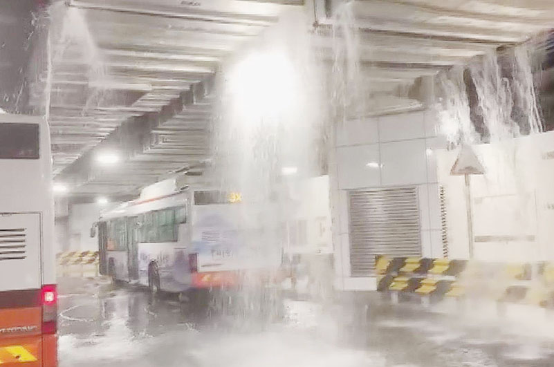 本澳上週六(四日)下暴雨,關閘地下巴士站兩側車行道及備用車停泊區天花排水設施接駁位置一度出現漏水。交通事務局稱受五月四日暴雨影響,關閘地下巴士站兩側車行道及備用車停泊區天花排水設施接駁位置漏水,地面輕微積水,但巴士服務運作及乘客上落車均未受影響。