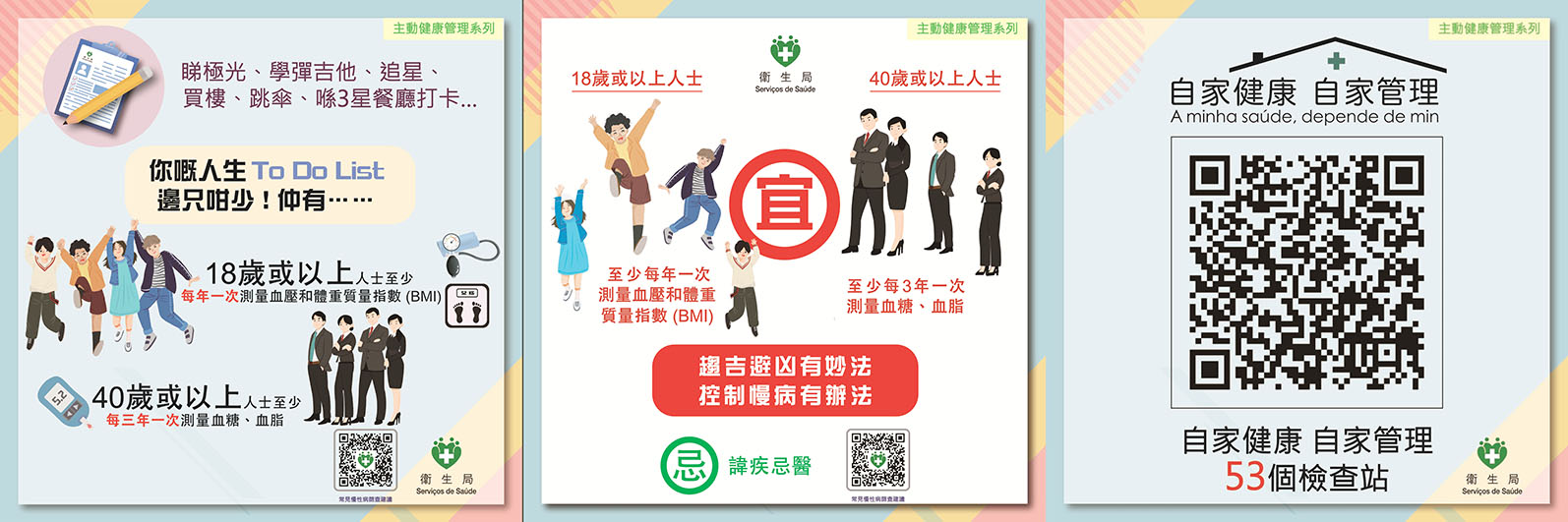 衛生局推動社區及機構在工作場所、社會服務設施等,增設血壓和體重測量設備,提升居民測量血壓和體重便利性,推動主動健康管理包括: 1、開展“健康企業”計劃:現時有17間本澳企業參與,近10萬名員工積極響應,當中有15間企業於工作地點設置測量血壓和體重設備供員工使用。2、建立“慢性病管理質量評價體系”:首階段以糖尿病和高血壓為試點,已完成本澳糖尿病和高血壓防控的基線評估並已設定本澳的評估指標及恆常監測機制,現正持續透過多專業參與,通過改進醫療服務環節對各項指標的結果進行優化。3、推動主動健康管理:推出“常見慢性病篩查建議”、持續開展“自家健康 自家管理”計劃和“慢性病自我管理工作坊”等。