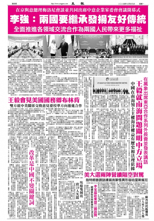 李強指出,中意全面戰略夥伴關係持續深入發展,將為中意經貿合作營造更穩定的預期,帶來更廣泛的機會,吸引更充沛的資源。中國正以高品質發展全面推進中國式現代化,中國共產黨二十屆三中全會對進一步全面深化改革、推進中國式現代化作出系統部署,這不僅將推動中國經濟規模較快增長,也將促進經濟優化升級,持續釋放出巨大發展潛力,為兩國企業合作提供廣闊空間。當前新一輪科技革命和產業變革深入推進,全球產業鏈的合作與重塑孕育著無限商機。中意要在順應大勢中發掘合作新機遇,把兩國互利合作引向深入。要支援雙方企業深挖智慧製造、新能源、生物醫藥等領域合作潛力,持續拓展合作廣度與深度。 李強強調,中國開放的大門將始終向義大利等各國企業敞開。我們將打造透明穩定可預期的制度環境,進一步放寬市場准入,保障外資企業國民待遇,為各國企業在華投資興業提供更多支援便利。希望中意企業家把握機遇、並肩前行,既實現企業自身的更大發展,也把兩國共同利益的蛋糕越做越大,把兩國友好合作的關係越拉越緊。