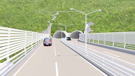 工程將分期開展,首期工程主要包括建造大潭山隧道段、南連接線及其北端出入口,隧道段全長約六百米,為雙向四車道的穿山隧道,穿越大潭山;南連接線全長約四百米,分別連接至偉龍馬路和機場大馬路,而北端出入口段約一百六十米至信安馬路止。是次工程採用預先評定資格之限制招標方式進行,設計連施工期最長為一千一百六十五個工作天。至於位於北安一側的北連接線連接至澳門大橋的高架橋將適時開展。
