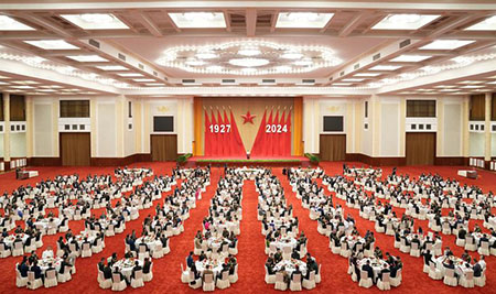 人民大會堂宴會廳燈火璀璨,近千名中外嘉賓歡聚一堂,現場氣氛喜慶熱烈。主席臺上方高懸著莊嚴的“八一”軍徽,10面鮮豔的紅旗分列兩側,“1927-2024”的大字年號格外醒目。