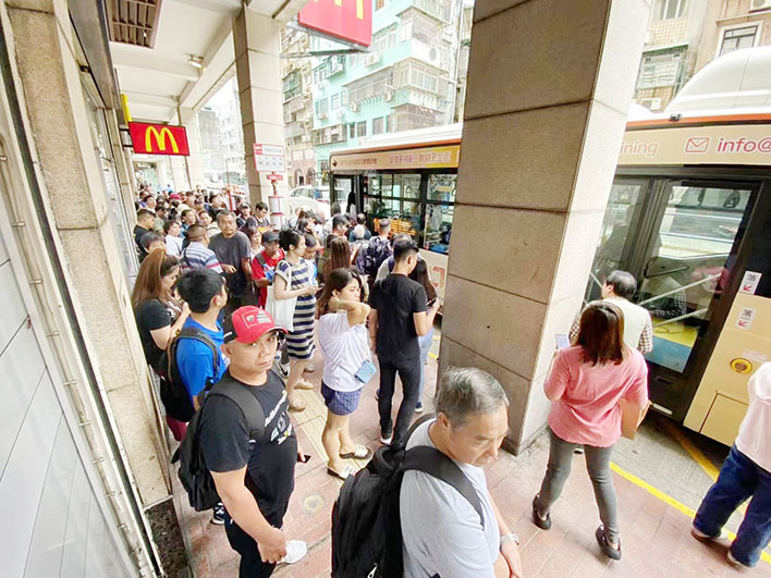 改發三號風球後,公共交通服務昨日下午二時起陸續恢復,在關閘廣場有大批市民和旅客排隊等巴士,基本所有巴士路線都排長龍,部分路線逾一百人排隊,有巴士因應情況提早十分鐘開出首班車。在亞馬喇巴士總站亦有大批乘客等候,現場有巴士公司工作人員維持秩序。而沙梨頭一帶的多個巴士站亦有人龍,部分巴士到站都已滿載,未能疏散人流。