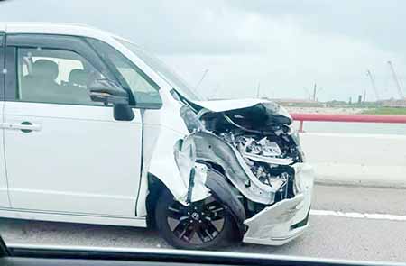 【特訊】一部泥頭車於昨日行經友誼大橋期間「甩轆」,其中一個車輪彈至對面行車線,擊中一部私家車,車頭嚴重損毀,一家四口受傷。消防接報到場將傷者送院治理。警方已對該名泥頭車司機作出檢控,正進一步調查意外起因。另外,黑沙環友誼橋大馬路昨日晚上七時許發生四車碰撞事故,共有八名傷者,治安警目前正調查事故原因。