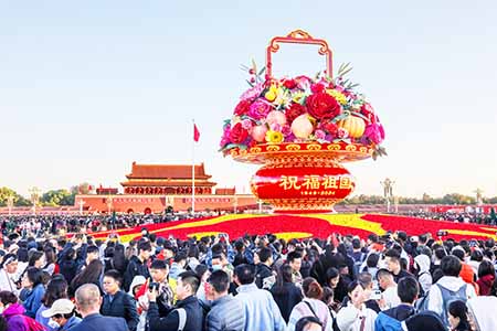 北京市花木有限公司總工程師張先哲一大早來到天安門廣場,檢查花卉景觀效果。今年,天安門廣場中心“祝福祖國”花壇首次以蔬果花籃形式呈現,花籃內的部分牡丹、月季和菊花的花型以具有自主知識產權的新品種為原型,進行了新花型的創作。