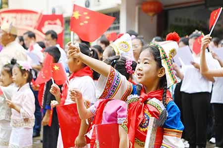 此外,中國各地當天也有慶祝國慶的活動,河南洛陽新安縣世紀廣場,12對新人參加集體婚禮,喜結良緣,新人們通過這種方式倡導婚慶新風,與祖國同慶;山東泰安,泰山之巔旭日破雲,光芒萬丈。來自五湖四海的遊客手舉五星紅旗,匯聚泰山,為祖國送上真摯祝福。在雄壯國歌聲中,五星紅旗緩緩升起,迎風飄揚。遊客自發跟唱國歌,歌聲響徹山巔;在雲南省麗江市玉龍納西族自治縣,各族群眾在升國旗儀式後進行民族團結打跳活動;江蘇省連雲港市海州區吾悅廣場,健身愛好者進行健身操集體會操表演。(完)