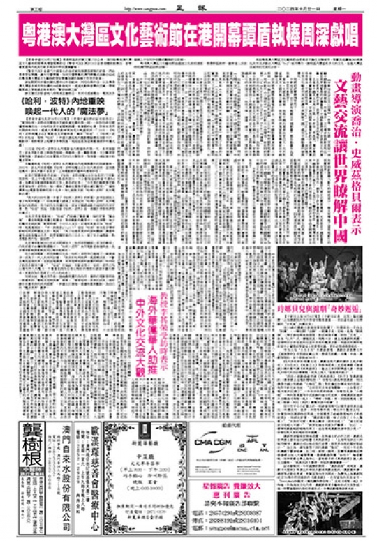 【香港中通社10月17日電】香港特區政府康文署17日公佈,第四屆粵港澳大灣區文化藝術節開幕典禮暨開幕節目《聲音河流》將於19日在香港體育館舉行。音樂會更邀得內地流行歌手周深作特別嘉賓獻唱。