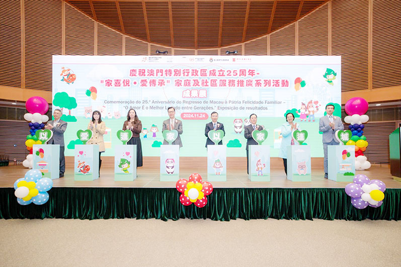 【特訊】2024年為國際家庭年30周年及澳門特別行政區成立25周年,社會工作局聯同澳門工會聯合總會、聖公會澳門社會服務處,以及6個“分區協作聯網”共40多間社服機構,於昨日(24)日假澳門科學館會議廳舉辦慶祝澳門特別行政區成立25周年 -“家喜悅‧愛傳承”家庭及社區服務推廣系列活動成果展,由社會工作局副局長鄧玉華、中央人民政府駐澳門特別行政區聯絡辦公室社會工作部副部長趙河清、教育及青年發展局代副局長蔡敏芝、法務局行政及財政管理廳廳長李勝里、文化局讀者服務及推廣處處長林穎娜、衛生局護士長余斌、澳門工會聯合總會副會長張國然、聖公會澳門社會服務處服務總監葉鑑波主持啟動儀式。現場設有親子沉浸式互動劇場、時光走廊體驗、圖畫填色攤位、家庭教育成品展示、吉祥物拍照,以及活動主題微電影“以愛連城”首映等,共有800人次參與。