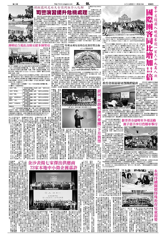 【特訊】統計暨普查局資料顯示,2024年10月隨團入境旅客按年上升14.2%至19.4萬人次。酒店業場所的客房平均入住率按年上升4.5個百分點至87.3%,住客減少5.8%至117.6萬人次,住客平均留宿時間維持在1.6晚。