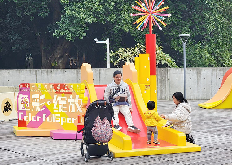 一家大小到場的香港旅客黃先生表示,小朋友非常喜歡現場的藝術裝置,玩得很開心,期望之後再來遊覽時,園區內有更多親子遊玩裝置;香港旅客曹先生稱,遊覽時被色彩繽紛的藝術裝置吸引,於是到場拍照打卡,他認為,澳門炮竹行業過去在香港非常有名,園區除開展不同元素的活化工作外,亦可加強炮竹廠的歷史展示及宣傳。