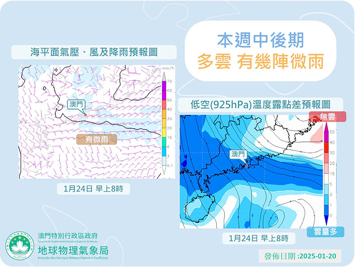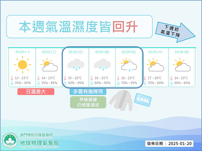 氣象局表示,近日天晴及非常乾燥,在風力微弱的情況下,晚間輻射冷卻效應較強,而日間升溫效應則較大,導致日夜溫差相當大。進入冬季以來,本澳降雨持續偏少及天氣乾燥。預料本週中期開始,本澳將轉受一股偏東氣流影響,雲量將有所增多,且週三至週五(二十二至二十四日)將有幾陣微雨。