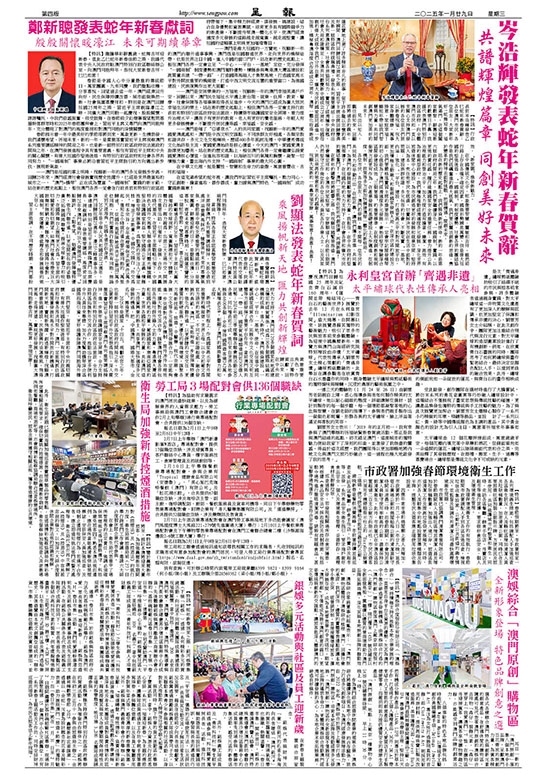 【特訊】行政長官岑浩輝發表乙巳蛇年新春賀辭:各位澳門市民、各位朋友:大家新年好!蛇舞迎春,福氣滿門。在這個闔家歡聚、辭舊迎新的歡樂日子裏,我謹代表澳門特別行政區政府,向全體澳門市民和一直以來關心支持澳門發展的各位朋友們致以新春祝福,祝大家身體健康,萬事勝意,家庭幸福!願蛇年帶給我們智慧與力量,共同開創澳門更加美好的未來!