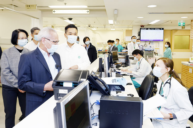 岑浩輝1月29日早上在社會文化司司長柯嵐及衛生局局長羅奕龍等陪同下,首先到仁伯爵綜合醫院視察。一行先後巡視了急診部及救護車區,關懷醫護人員的工作情況。之後途經血液透析室慰問在場的求診人士,並與醫院當值人員親切交談,為他們打氣。