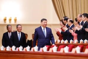 党和國家領導人習近平、李強、趙樂際、蔡奇、丁薛祥、李希、韓正等在主席臺就座,祝賀大會召開。