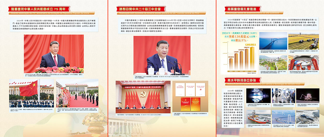 展覽在序章部分介紹了國家發展取得新的偉大成就。回顧2024年,隆重慶祝了中華人民共和國成立75周年,勝利召開中共二十屆三中全會,國家高質量發展扎實推進,高水平科技自立自強,人民群眾幸福生活多姿多彩,中國特色大國外交更有作為。
