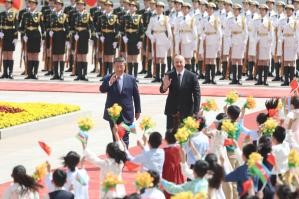 會談前,習近平和夫人彭麗媛在人民大會堂東門外廣場為阿利耶夫和夫人阿利耶娃舉行歡迎儀式。