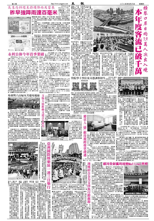 【特訊】截至2025年5月7日14時,橫琴口岸本年度通關客流量破一千萬人次,日均7.9萬人次出入境,較去年同期比增加32%。這次是刷新橫琴口岸自2000年通關以來客流破千萬的最快紀錄,較2024年6月22日破千萬記錄提前了46天。通關客流結構方面,澳門居民佔25.3%、旅客佔37.8%、非本地居民高等院校學生佔21.4%、外地僱員佔15%、其他人員則佔0.5%。於本年內地勞動節假期內,橫琴口岸更連續兩天刷新客流記錄,5月1日和5月2日分別錄得10.4萬人次和12.8萬人次出入境。