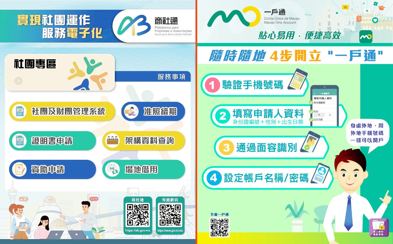 特區政府透過跨部門數據互聯互通,優化服務流程,分別推出「一戶通」、「商社通」、「公務通」三個電子政務服務平台。截至今年三月底,「一戶通」範圍包括優化民生服務,拓展電子身份應用場景,非永久性居民身份證續期等電子服務,車保續期,稅務服務實現電子通知取代掛號信件。「商社通」提供超過一百一十項服務,簡化公共服務流程,開展補習社藥房准照等一站式申請服務,推動報關清關等跨部門合作業務納入平台。「公務通」實現公務人員人力資源管理全流程電子化。此外「一戶通」3.0和「商社通」2.0預計二○二七年推出,未來還將引入AI技術,實現智能輔助服務,針對不同群體推送適用功能,進一步簡化政務辦理程序。