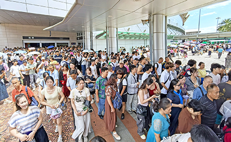【特訊】澳門氣象局在昨日下午一時取消所有熱帶氣旋警告信號,並預料本周中後期,受一個低壓區影響,本澳驟雨增多及有雷暴,昨日取消所有風球,天氣部份時間陽光普照,雖然雲層較多,但始終沒有下雨,趁暑假尾聲,昨日內地來澳遊玩旅客十分多,早上拱北口岸過關人潮絡繹不絕,關閘的士站候車乘客大排長龍。