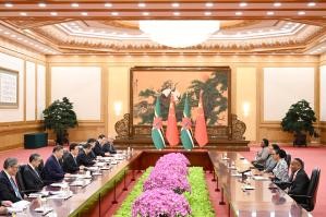 【中新社北京10月14日電】10月14日上午,中國國家主席習近平在北京人民大會堂會見來華出席全球婦女峰會的多米尼克總統伯頓。