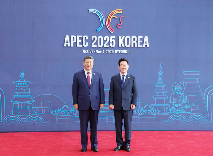 習近平抵達會場時,韓國總統李在明熱情迎接。