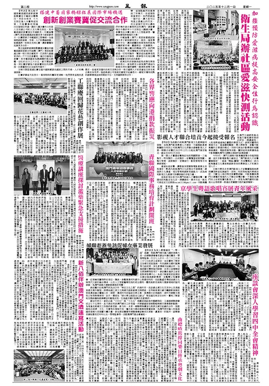 另外,由婦聯青年協會主辦、澳門基金會贊助的“二○二五年紅絲帶社區愛滋病預防推廣系列活動嘉年華”日前圓滿落幕。現場設置攤位遊戲、歌唱表演及多個互動環節,旨在提升居民對愛滋病防治的關注,呼籲社會各界與青少年增強防範意識、反思並避免歧視,共建關愛社區,現場吸引近千人次參與。