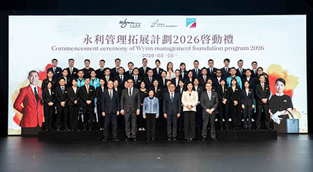「永利人才薈萃 – 新世代領航典禮2026」於3月2日假永利澳門宴會廳舉行,永利澳門及永利皇宮人力資源高級副總裁蘇家雯女士在致詞時表示,永利多年來一直致力深耕本地人才發展,透過完善的內部培訓機制為本澳居民提供全方位培訓及事業發展機會。自與勞工局合作推出專項招聘計劃以來,公司得以更有針對性地吸引年青新血加入酒店業,接觸的層面亦較以 往廣泛,讓人才培訓計劃更具方向、更見成效,為澳門未來發展注入源源不絕的新動力。